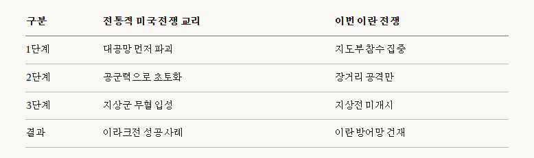 미국의 전통적인 전쟁 교리는 명확합니다. 첫째, 적의 대공망을 먼저 파괴합니다. 둘째, 대공망이 제거되면 공군력으로 상대를 초토화합니다. 셋째, 저항 능력이 사라진 상태에서 지상군이 무혈 입성합니다. 이라크전에서 이 공식이 잘 드러났습니다.