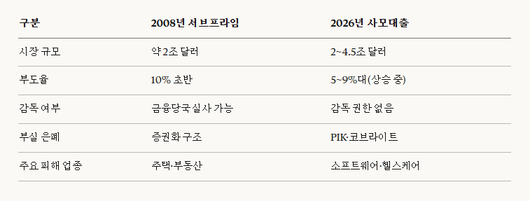 사모대출 문제는 규모, 부도율, 감독 부재, PIK 방식의 부실 은폐라는 네 가지 구조적 위험이 동시에 맞물려 있습니다. 2008년 서브프라임 위기와 비교했을 때 규모는 이미 동급이고, 부도율은 빠르게 근접하고 있습니다. 다만 2008년과 달리 감독 권한이 없는 사모 시장이라는 점에서 어떤 면에서는 더 사각지대에 놓여 있습니다.