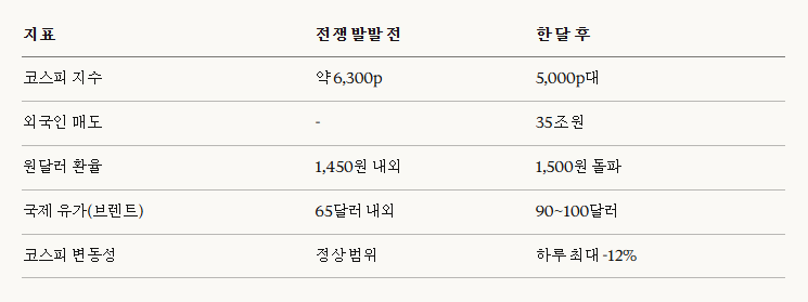 이란 전쟁이 터진 지 한 달이 지났습니다. 전쟁 발발 첫 거래일에 코스피가 7% 빠지더니 다음 날 12%가 추가 하락했습니다. 지수가 하루에 12% 빠진 건 경력 20년이 넘는 증권사 전문가도 처음 본 일이었습니다. 웬만한 개별 종목은 25%가 증발했습니다. 그 이후로도 오르락내리락 변동성이 극심한 장이 한 달째 이어지고 있습니다.